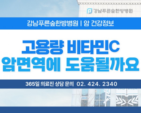 안녕하세요.강남푸른숲한방병원입니다. 암 치료 중에는 체력 저하,면역력 약화, 항암 부작용 등다양한 신체적 어려움이 동반되기 때문에,이를 보완하고 회복을 촉진하는보조치료에 대해 환자분들의관심이 높습니다.그 중 한가지가 바로고용량비타민C 주사요법인데요.비타민C는 매일 먹는영양제로 . . .