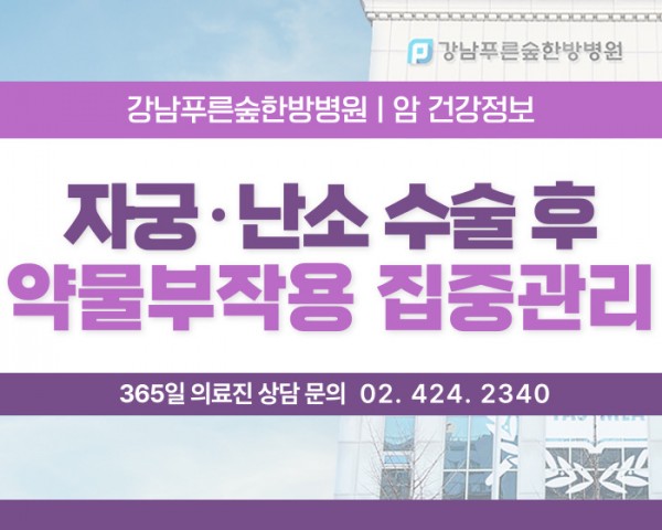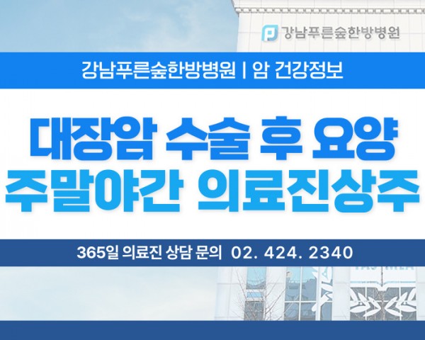 안녕하세요.강남푸른숲한방병원입니다.유방암 수술 후의 회복은신체적 치료와 함께심리적 안정과 삶의 균형을 되찾는과정이 되어야 합니다.강남푸른숲은여성 암 환우분들의안정적인 회복을 위해여성암병동을 별도 운영하며,의료진의 24시간 상주로세심한 관리 아래수술 전후, 항암 전중후치료 프로 . . .