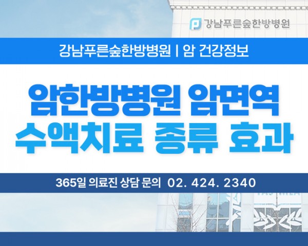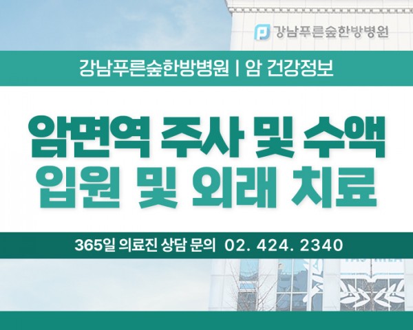 안녕하세요.강남푸른숲한방병원입니다.암 수술, 항암 치료 후회복과 재발 및 전이 예방암면역 치료를 알아보시는환자분들과 보호자분들을 위해오늘은 암면역주사에 대한 내용을나눠보려고 합니다.수술이나 항암제, 방사선 치료는암을 직접적으로 제거할 수 있는치료법이지만 이 과정에서몸의 면역 체계 또한상 . . .