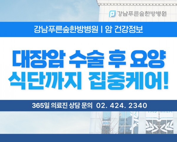 안녕하세요.대장암수술후 요양 입원강남푸른숲한방병원입니다.대장암은 국내에서발병률이 높은 암 중 하나입니다.초기에 발견하여 적절한 치료와수술을 시행하는 것이 중요하며,이후 관리를 어떻게 하는지에 따라환자의 예후에도 영향을 미치는데요.이 때문에 체계적인 관리와 회복을 돕는 . . .