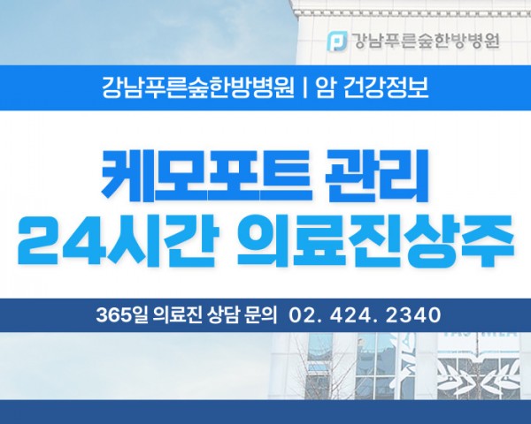 안녕하세요.강남푸른숲한방병원입니다.강남푸른숲은15년 이상 암 환우 진료경험을 가진 대표원장님과주말 및 야간까지 24시간 상주하는 의료진, 간호사 팀이암면역 치료와 회복을 위해최선을 다하고 있습니다.오늘은 항암 치료 과정 중많이 시행되는 케모포트 시 . . .