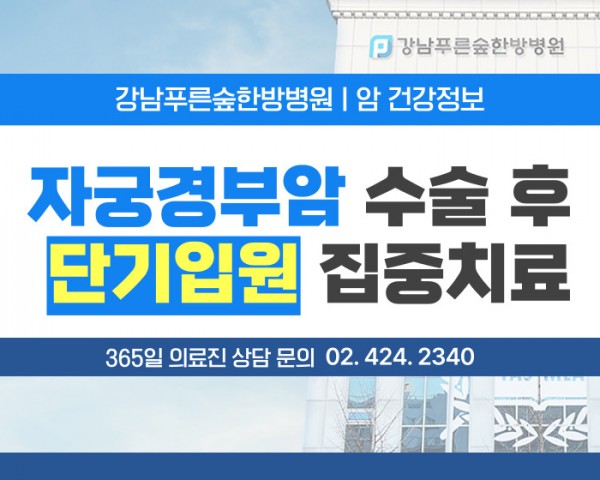 안녕하세요.강남푸른숲한방병원입니다.자궁경부암은자궁의 입구 부분인'자궁경부'에서 발생하는 암으로,국내 여성 암 중에서도흔히 진단되는 암 중 한가지입니다.조기 발견 시에는수술과 방사선, 항암 치료를 통해완치를 기대해볼 수 있지만수술 과정에서 하복부의 주요 조직과혈관, 림프절을 건 . . .