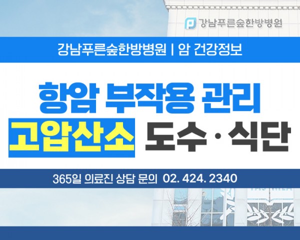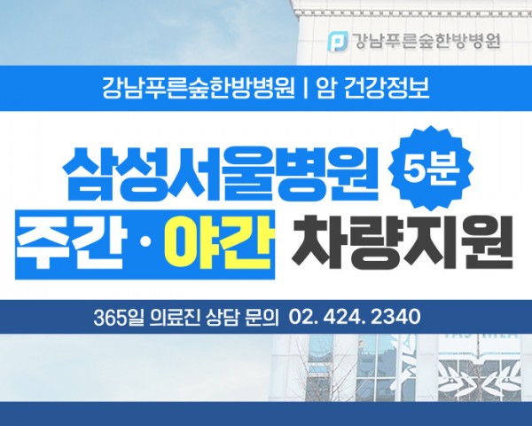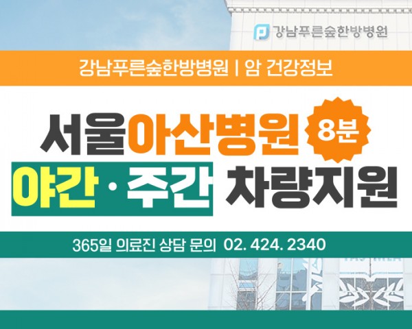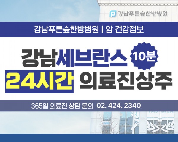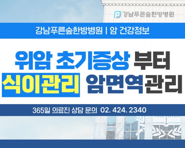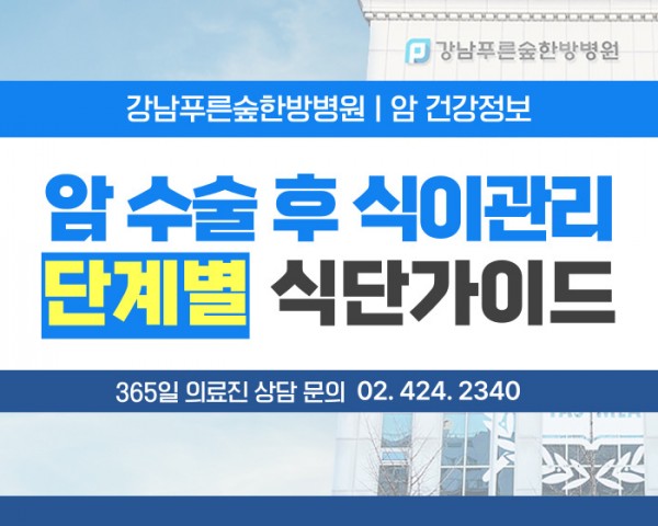 안녕하세요.강남푸른숲한방병원입니다.암 진단을 받고치료를 시작하시는 환자분들께서는수술, 항암, 방사선 치료 등다양한 과정을 거치며신체적인 치료와 함께세심한 관리가 매우 중요해집니다.특히 면역력의 회복은암 치료 이후 회복 속도를 결정짓는핵심적인 요소 중 한가지인데요.이를 위해 안정적이고 편 . . .