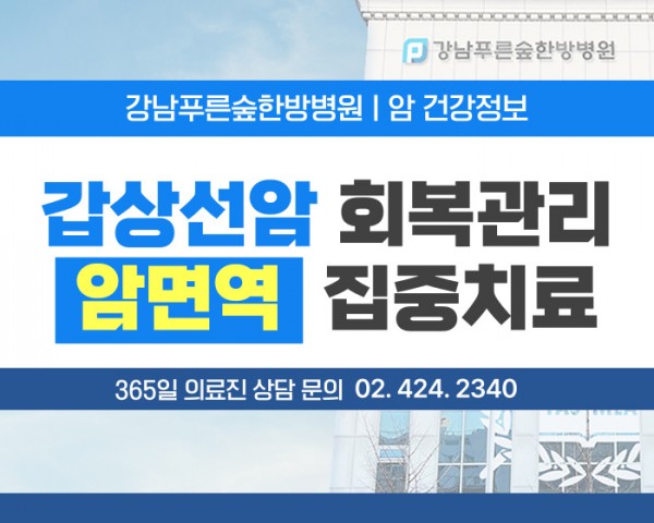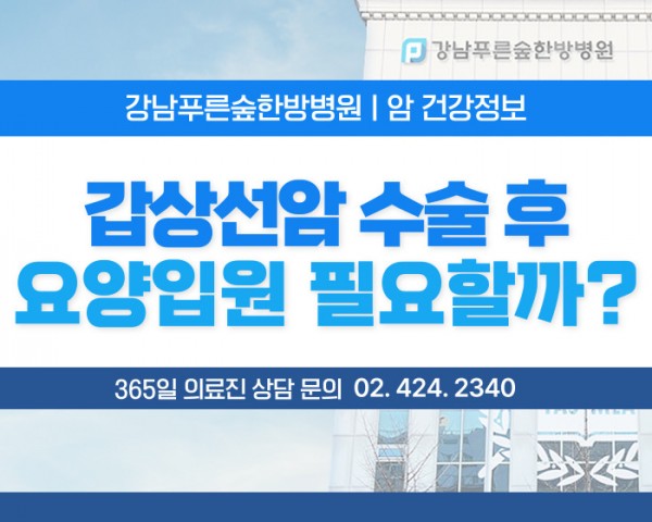 안녕하세요.강남푸른숲한방병원입니다.많은 환우분들께서갑상선암 수술을 마친 뒤,"이 정도면 바로일상 생활로 복귀해도괜찮지 않을까?""굳이 돈과 시간을 들여요양이 필요할까?" 하고 고민에 빠지곤 합니다.실제로 갑상선암은 비교적예후가 좋은 암으로 알려져 있지만,수술 이후 몸의 균형을 . . .