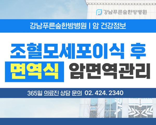 안녕하세요.강남푸른숲한방병원입니다.조혈모세포이식은혈액암 환자에게중요한 치료법입니다.이식 후 회복기에는철저한 감염관리와 면역력 회복,영양관리가 반드시 필요하기 때문에암요양병원이나 한방병원을알아보시는 분들이 많으신데요.오늘은 조혈모세포이식 후요양병원에서 받아보실 수 있는치료와 관 . . .