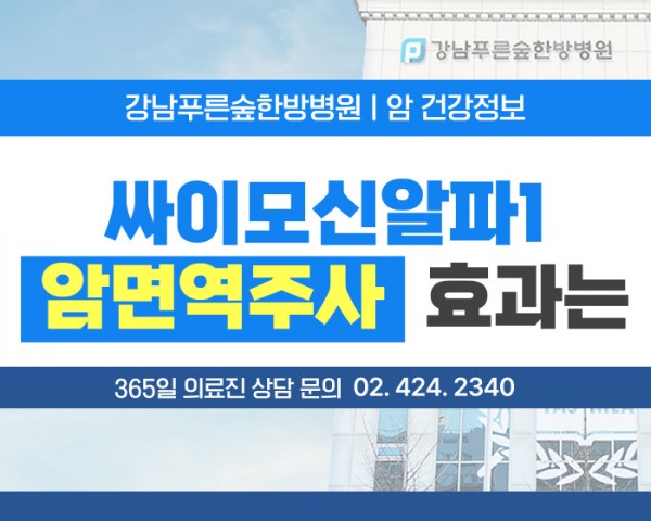 안녕하세요.강남푸른숲한방병원입니다.오늘은 암면역주사 중가장 많이 문의주시는싸이모신알파1에 대한내용을 준비해보았습니다.짧게 시간내어 읽어보시고암면역주사에 대해 알아보실 때도움이 되셨으면 좋겠습니다.입원 및 외래 진료 관련하여궁금하신 점 있으실 때에는언제든지 전화주시면,의료진이 직접 친절하 . . .