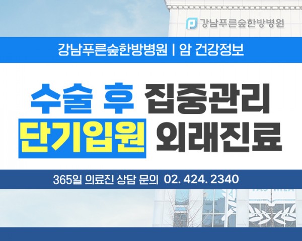 안녕하세요.서울암요양병원 인근강남푸른숲한방병원입니다.암수술후 입원 요양병원이나 한방병원에 입원하는 환자분들이 많습니다.수술 직후에는 체력과 면역력이 함께 저하될 수 있기 때문에 이 시기에 적절한 관리를 통해 회복에 도움이 될 . . .