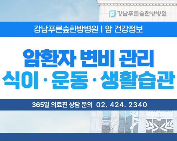 안녕하세요.강남푸른숲한방병원입니다.암환자의 변비 문제는매우 흔하게 발생할 수 있습니다.변비는 진행성 암환자의40%~90%가 경험하는것으로 알려져 있으며,적절한 관리와 치료 등을 통해일부 개선이 가능합니다.배변의 문제는 건강상의 부분도 있지만 삶의 질에도 영향을 미치기 때문에,의 . . .