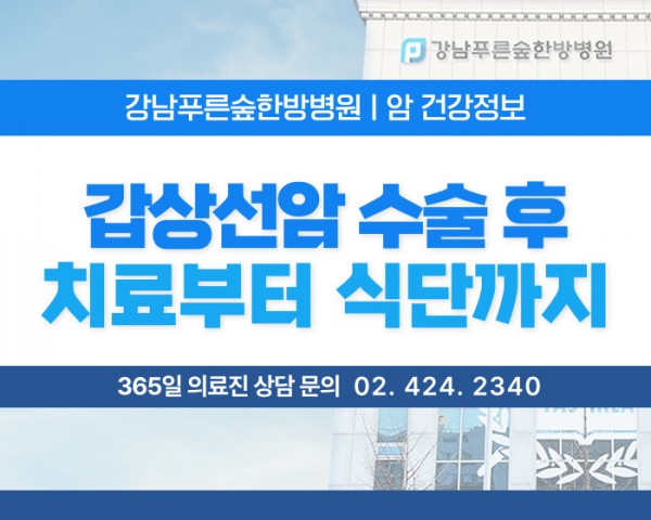 안녕하세요.강남푸른숲한방병원입니다.많은 환우분들께서갑상선암 수술을 마친 뒤,“이 정도면 바로 일상 생활로 복귀해도 괜찮지 않을까?”“굳이 돈과 시간을 들여요양이 필요할까?”하고 고민에 빠지곤 합니다.실제로 갑상선암은 비교적예후가 좋은 암으로 알려져 있지만,수 . . .