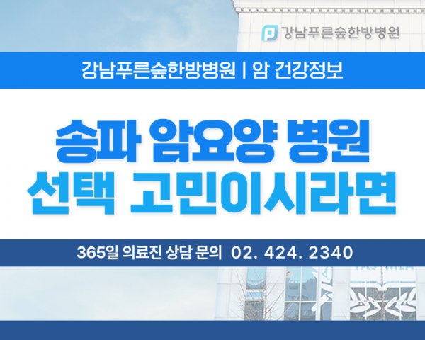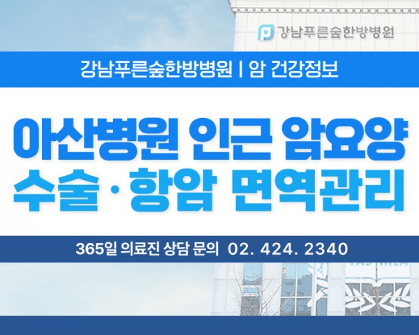 안녕하세요. 암요양 입원 치료를 진행하는 강남푸른숲한방병원입니다.암 진단을 받은 이후 치료와 관리는 환자와 보호자에게 모두 매우 중요한 문제입니다. 특히 암 치료 과정에서 체력을 유지하고, 면역력을 강화하여, 회복에 . . .